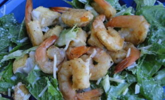 - Leg de slablaadjes op de schaal, bestrooi met een dun laagje Parmezaanse kaas, lepel een beetje saus in verschillende delen van de salade, dan een handvol croutons, bestrooi dun met Parmezaanse kaas, de volgende laag is gebakken garnalen, helften eieren, kers tomaten, giet er opnieuw de saus over en bestrooi met de rest van de kaas.