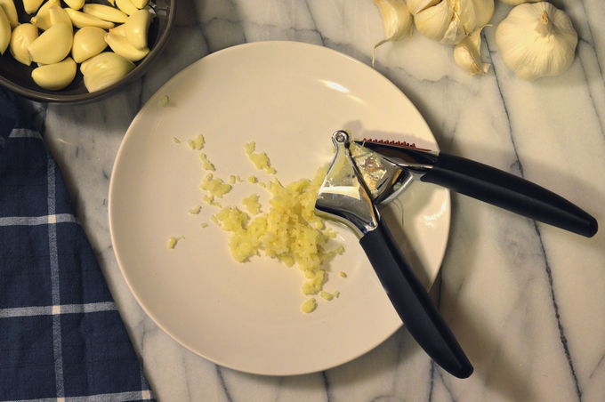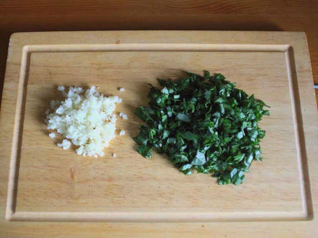 - Hak de knoflook in een knoflook, doe in een klein diep bord, voeg olijfolie, een snufje zout en gemalen peper toe.
