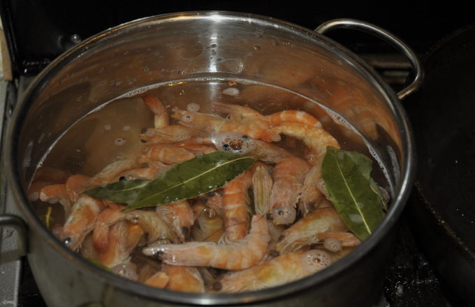 - Kook de garnalen in gezouten water, laat afkoelen en begin met schoonmaken.