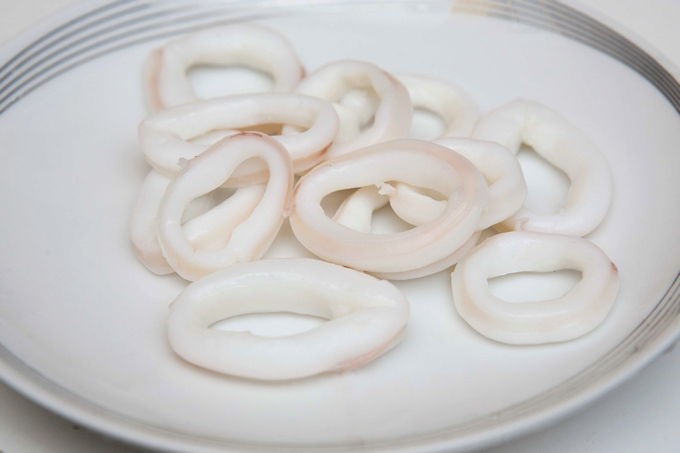 - Snijd de inktvissen in ringen, als ze groot zijn, kun je ze in tweeën delen.
