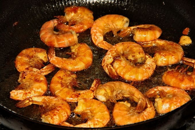 - Giet de garnalen 20 seconden met kokend water, giet het water af en doe ze in dezelfde hete pan, bak ze 3 minuten in boter en leg ze dan op een ander bord.