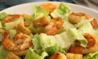 Een eenvoudig recept voor Caesarsalade met garnalen en Chinese kool