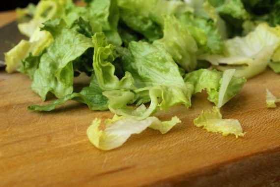 Verdeel de slablaadjes, was ze stuk voor stuk grondig, snij het onderste wortelgedeelte af, pluk ze met je handen in willekeurige stukjes.