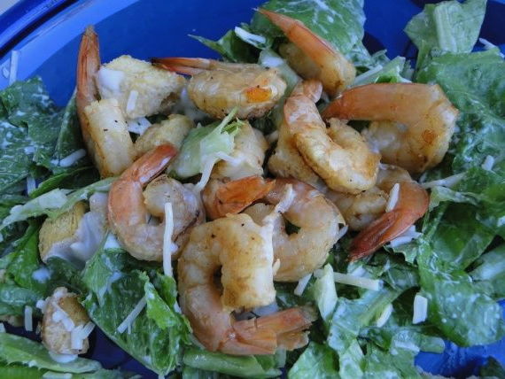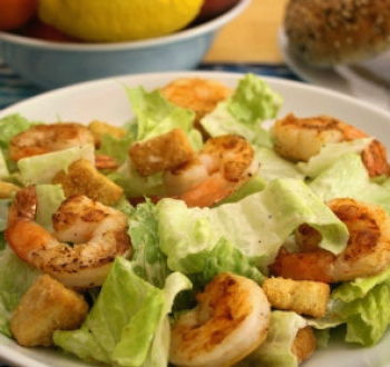 Simpele en heerlijke Caesarsalade met gebakken garnalen