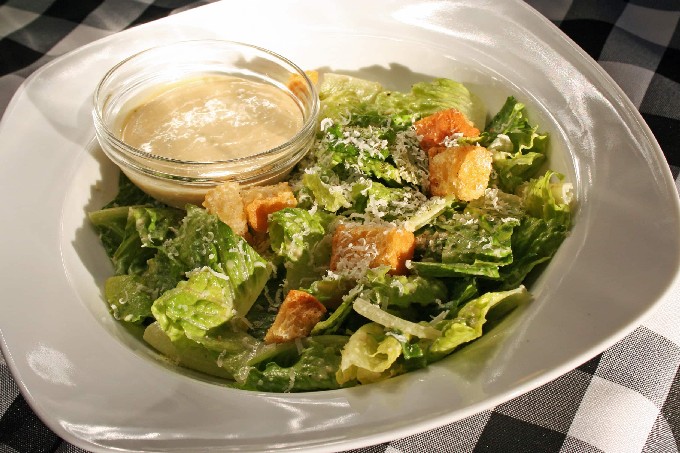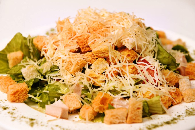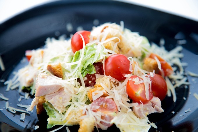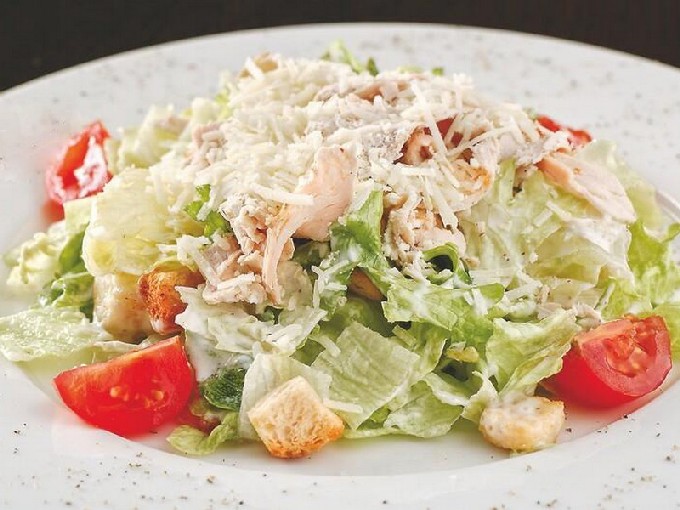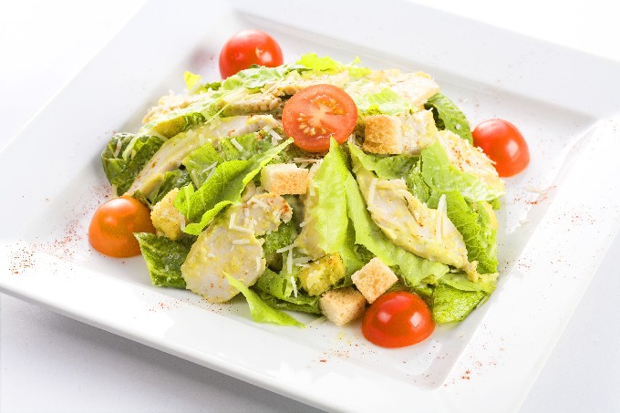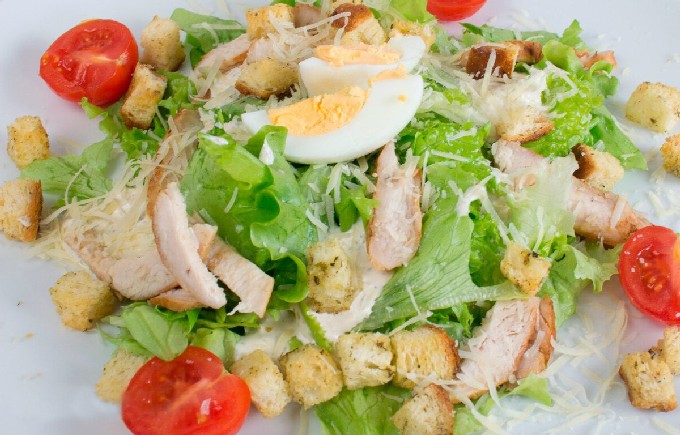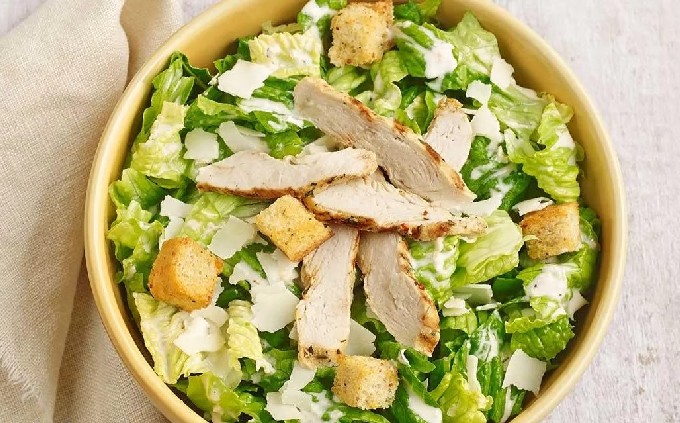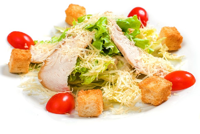 Caesar heeft voor dit recept dezelfde smaak waar veel mensen van houden: een combinatie van kipfilet, cherrytomaatjes, geraspte kaas en dressing. Het klassieke recept bevat croutons.
