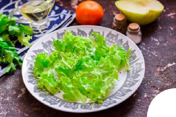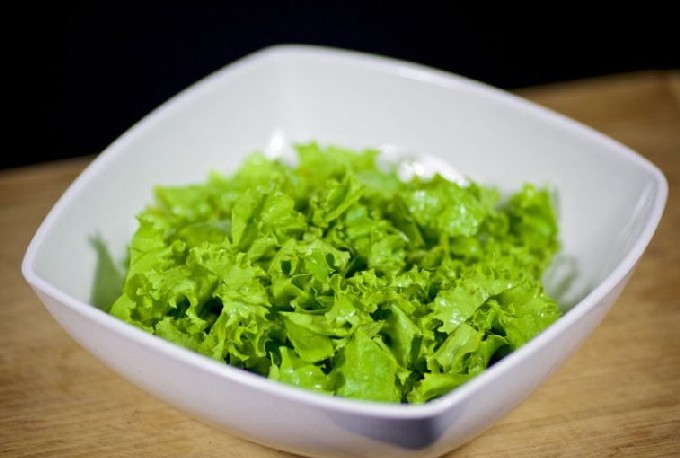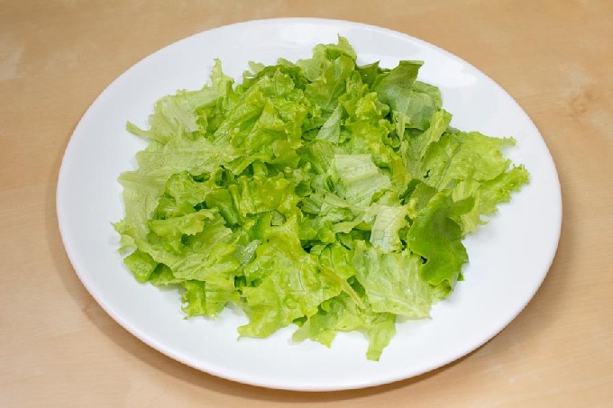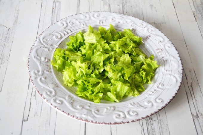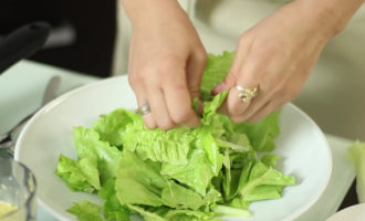 - Scheur de salade met je handen en leg op de bodem van een ondiep bord.