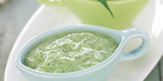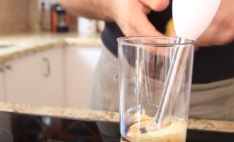 - Doe alle ingrediënten voor de saus en de dooier van het gekookte ei in een diepe plastic kan. Stamp met een staafmixer tot een gladde massa, je krijgt een dikke saus.