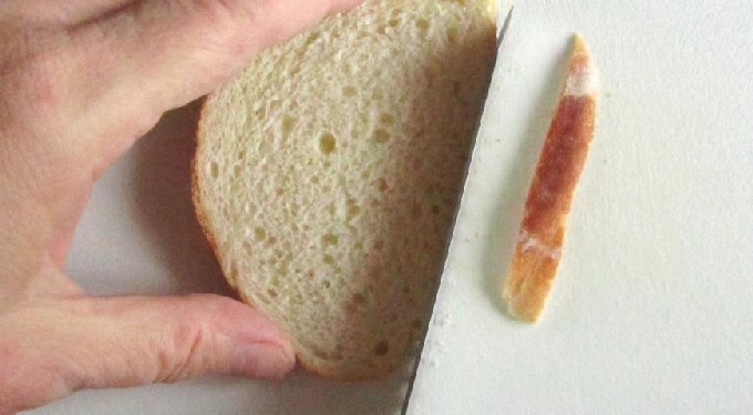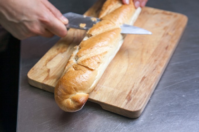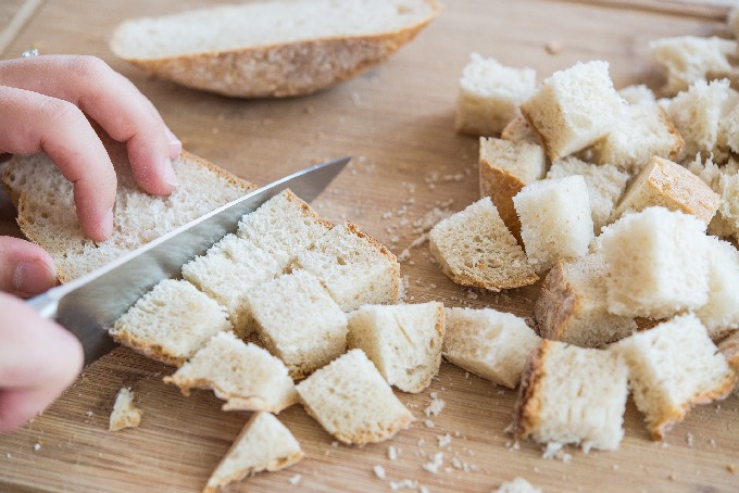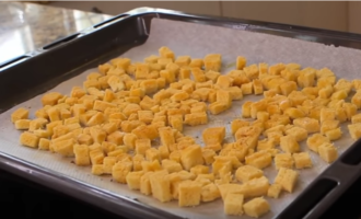 - Haal de korst van het stokbrood, snijd het in kleine stukjes en droog het op een bakplaat in de oven op 150 graden (of in de magnetron).