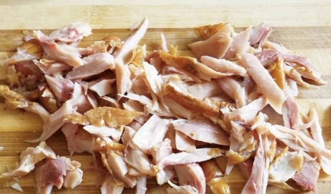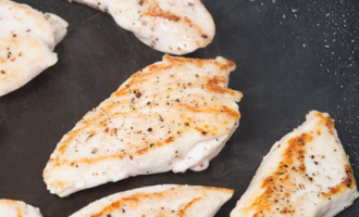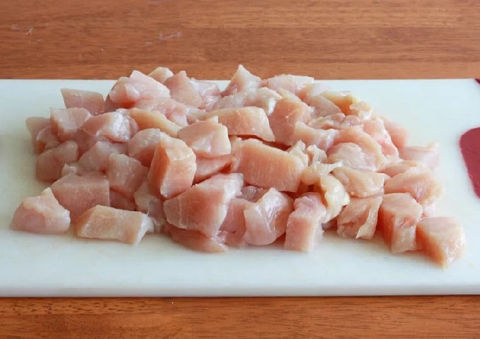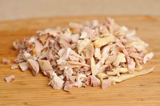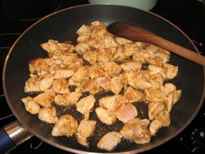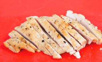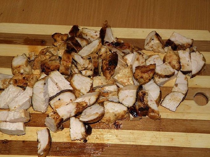 - Rasp de kipfilet met kruiden, vet in met olijfolie. Verhit een droge koekenpan, leg het vlees erin en bak 2 minuten, draai om en bak de andere kant 2 minuten, koel af. Snijd in blokjes of plakjes.