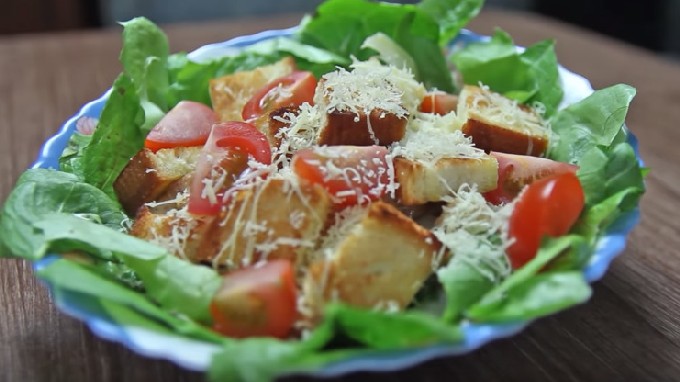 - Om de croutons te bereiden, verwijdert u de korsten van het toastbrood, snijdt u de kruimel in blokjes. Leg de toekomstige croutons op een bakplaat, besprenkel met olijfolie en bestrooi met kruiden. Zet in een op 110 graden voorverwarmde oven tot ze goudbruin zijn.Doe in een kom en laat afkoelen. De chef-kok neemt ook gewone kant-en-klare crackers en breekt ze eenvoudig in kleine stukjes met een deegroller (snelle optie).