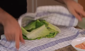 Was en droog de ijsbergsalade op een keukenhanddoek. Verwijder de bladeren van bovenaf en gooi ze weg, scheur de rest met je handen (niet snijden met een mes om bitterheid te voorkomen).