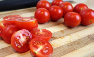 Was de cherrytomaatjes en snijd ze in 4 stukken of halveren. Snijd de kaas in dunne plakjes.