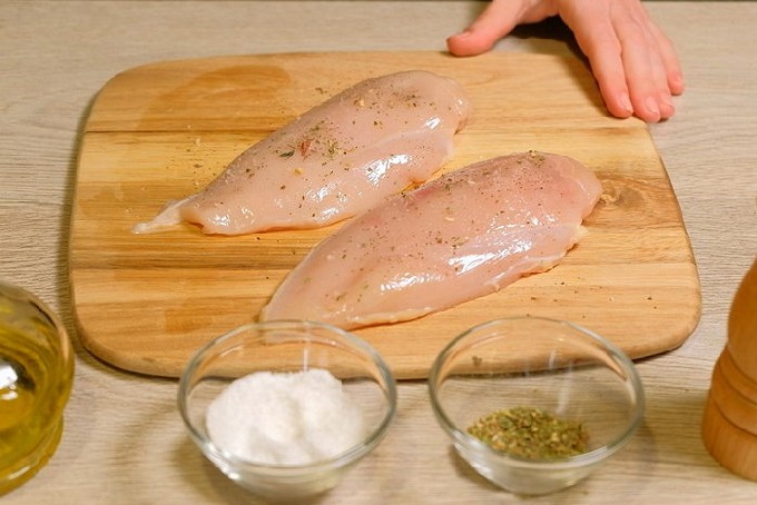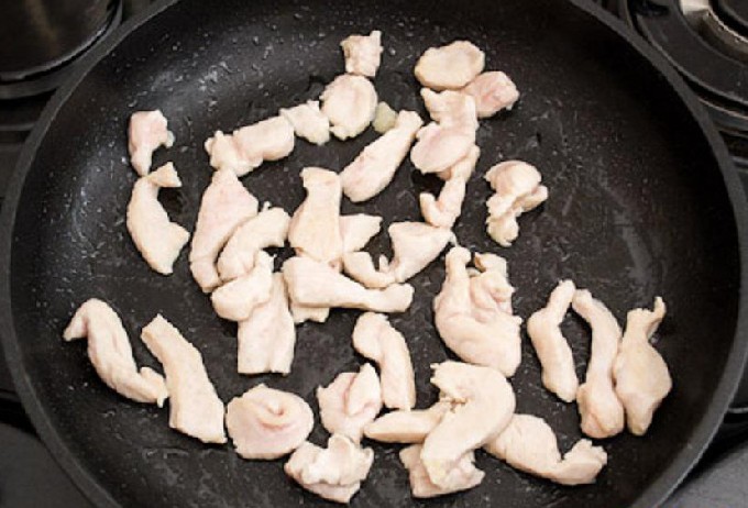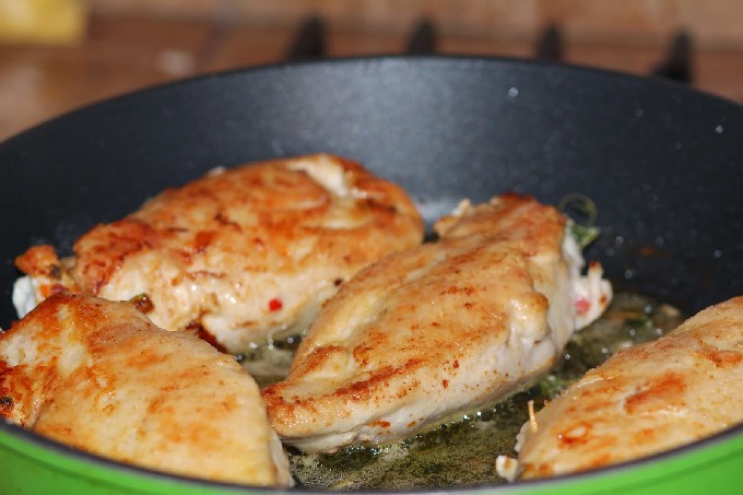 - Spoel de kipfilet af, verwijder de films, droog af met keukenpapier en snij horizontaal door. Verhit olijfolie in een koekenpan en bak de kip, pre-zout en peper.
