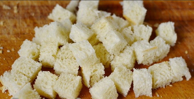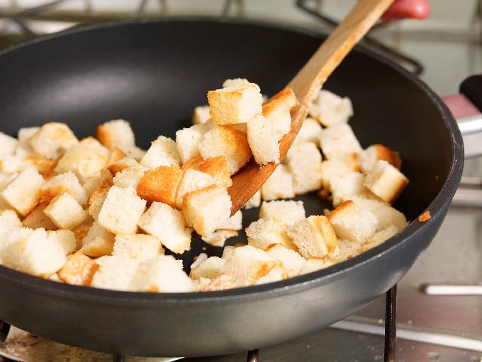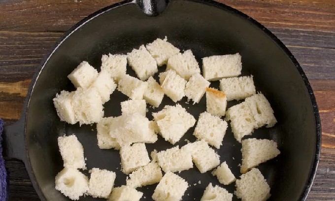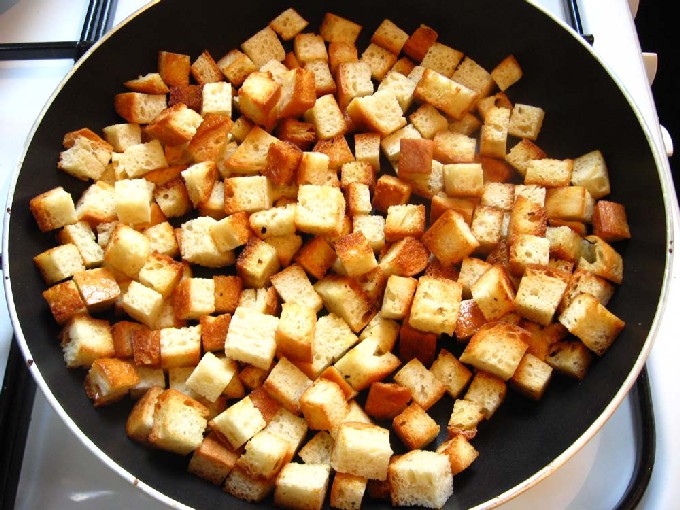 - Snijd het witbrood in kleine blokjes, besprenkel ze met boter, bestrooi met kruiden en roer. Giet in een hete koekenpan en bak al roerend ongeveer 5 minuten.