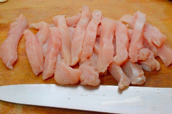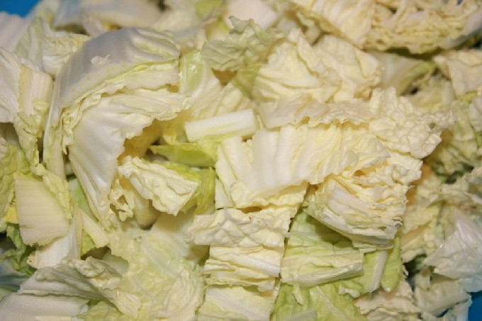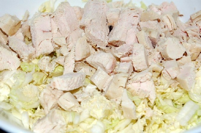 - Hak de Pekingkool grof. Bevrijd de kippenborst van huid en botten, kraakbeen. Snijd het in dunne platen.