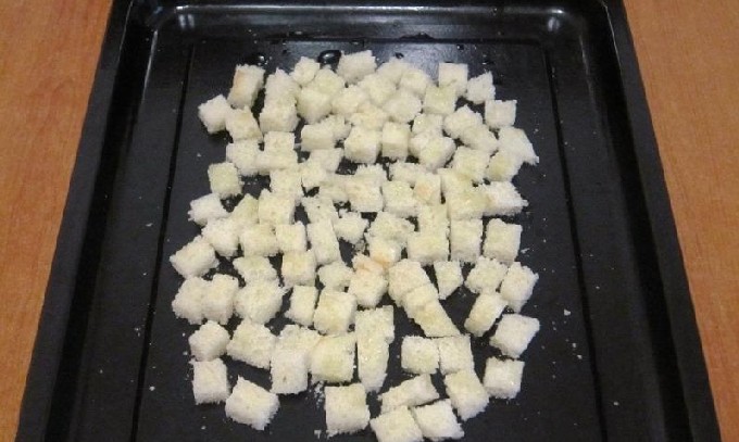 - Verwijder de korst van het brood, snijd de kruimel in kleine blokjes en doe de knoflookolie in een pan, bak tot ze goudbruin zijn. Bestrooi met kruiden (met Provençaalse kruiden blijkt het erg lekker). Verwijder op een bord en laat afkoelen.