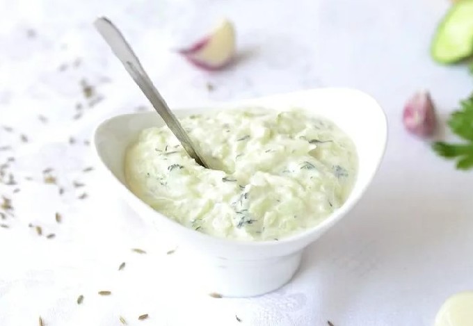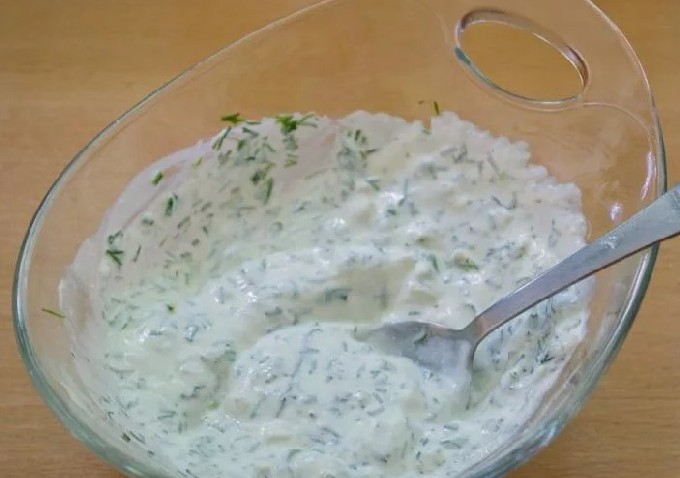 - Om een dressing te maken, doe je zure room in een aparte container, voeg je knoflook toe die door een pers is gehaald.