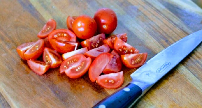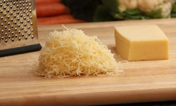 - Rasp de kaas op een fijne rasp (het is raadzaam om Parmezaanse kaas te kopen). Was de tomaat en snij in partjes, verwijder het harde witte gedeelte aan de onderkant.