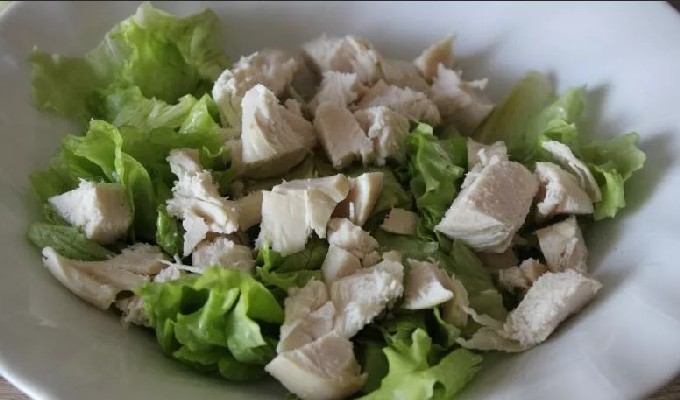 - Hak de slablaadjes grof, doe ze in een diepe slakom. Stuur de kip erheen, fijngeraspte Parmezaanse kaas, breng alles op smaak met saus en meng heel goed zodat elk blaadje sla bedekt is met dressing.