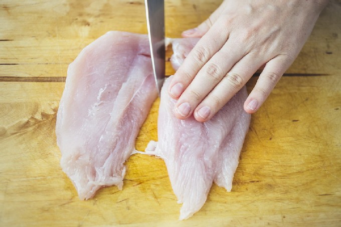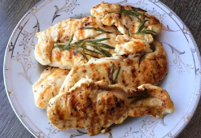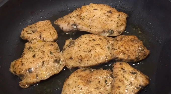 - Kipfilet afspoelen, drogen, horizontaal in twee dunne stukken snijden. Bestrooi met kruiden naar wens, zout en stuur naar de pan, waar de croutons werden gedroogd. Voeg indien nodig olie toe.