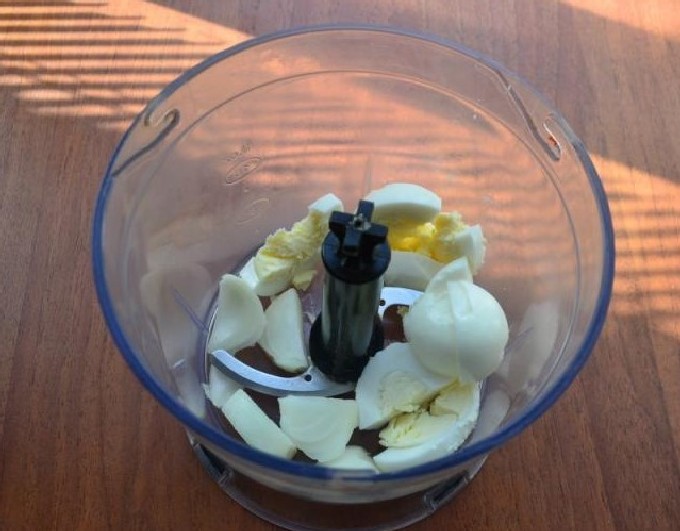 Eerst moet je de saus bereiden, deze moet worden toegediend en het aroma van knoflook absorberen. Kook de eieren 1 minuut, verwijder ze met een schuimspaan en doe ze in de blenderkom. Knijp er citroensap uit, voeg gepelde knoflook toe, passeer door een pers en fijn geraspte kaas. Pons met een blender tot een gladde massa.