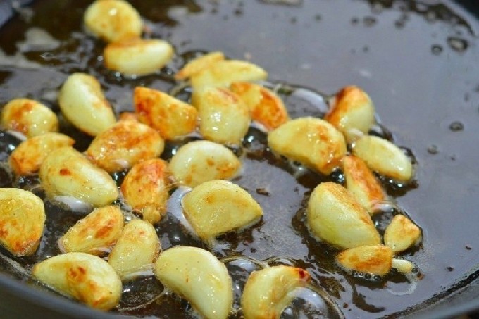 - Giet olijfolie in een koekenpan, verwarm, stuur daar gepelde knoflook. Fruit de knoflookteentjes in olie voor ongeveer 3-4 minuten en haal ze dan uit de pan.