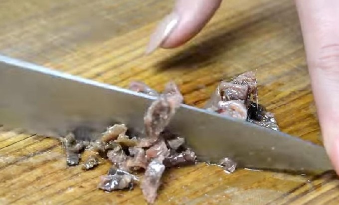 - Snijd de kappertjes heel fijn, gooi ze blanco in de saus. Doe hetzelfde met ansjovis. Klop de saus tot gecombineerd.