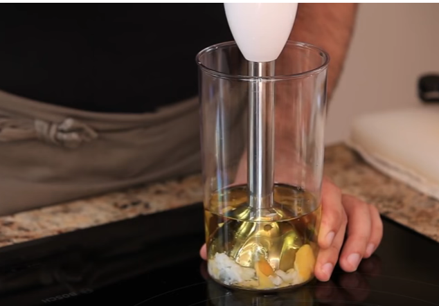 - Pons het mengsel met een blender. Voeg, zonder het apparaat uit te schakelen, in een dun straaltje de met elkaar vermengde olijfolie en zonnebloemolie in een kopje toe.