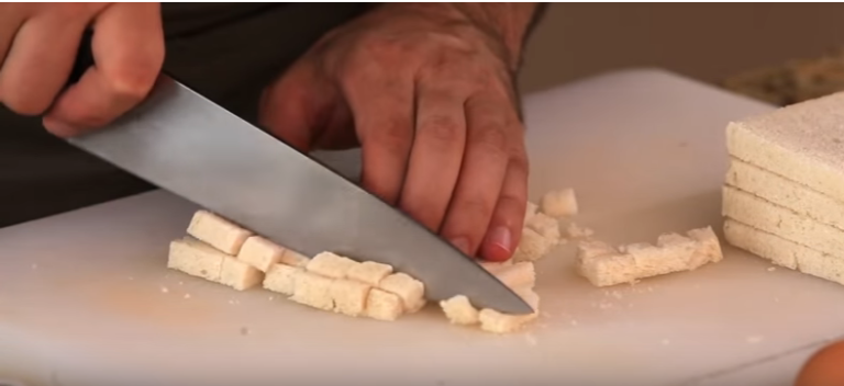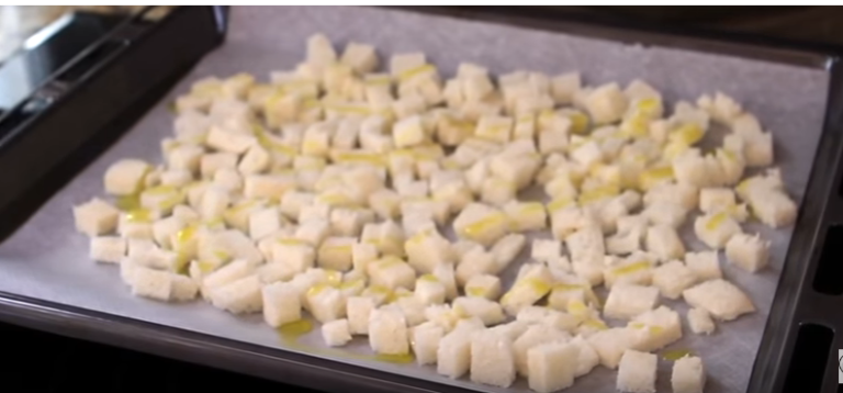 - Haal de korst van het stokbrood, snijd het in kleine stukjes en droog het op een bakplaat in de oven op 150 graden (of in de magnetron).