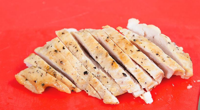 - Rasp de kipfilet met kruiden, vet in met olijfolie. Verhit een droge koekenpan, leg het vlees erin en bak 2 minuten, draai om en bak de andere kant 2 minuten, koel af. Snijd in blokjes of plakjes.
