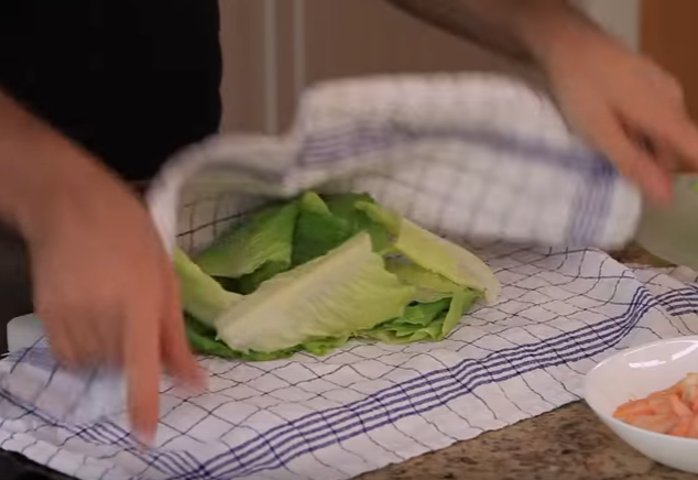 Was en droog de ijsbergsalade op een keukenhanddoek. Verwijder de bladeren van bovenaf en gooi ze weg, scheur de rest met je handen (niet snijden met een mes om bitterheid te voorkomen).