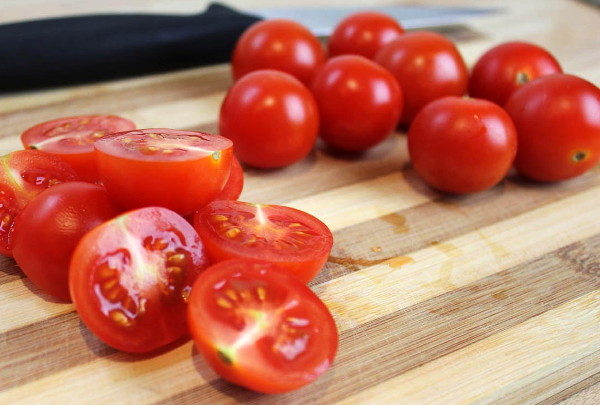 Was de cherrytomaatjes en snijd ze in 4 stukken of halveren. Snijd de kaas in dunne plakjes.