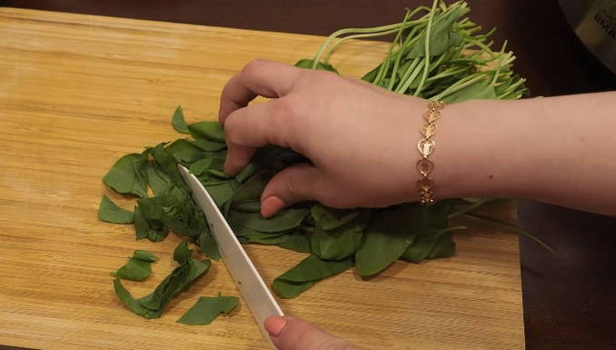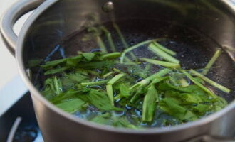 - Laten we verder gaan met het bereiden van het hoofdingrediënt. Aanvankelijk scheiden we de bladeren van de stengels, spoelen ze goed af en hakken ze willekeurig. Dan sturen we het meteen op om in de soep te koken.
