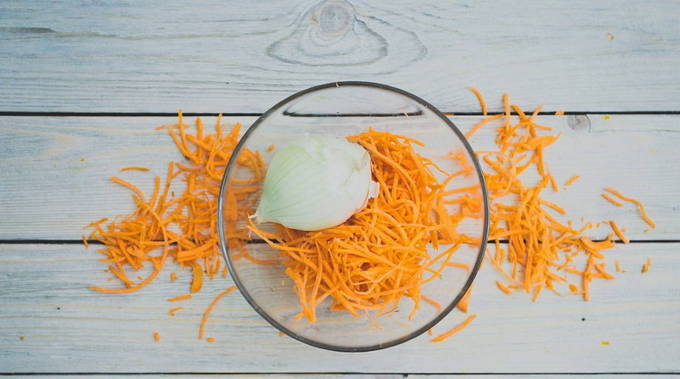 Rasp tegelijkertijd de geschilde wortelen op een grove rasp en hak de ui in kleine blokjes. We verwarmen een koekenpan met boter en sturen de groenten om te sauteren tot ze zacht zijn, af en toe roeren met een spatel.