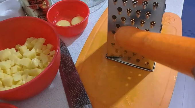 - Rasp de wortelen op een grove rasp en snijd de ui in kleine blokjes.