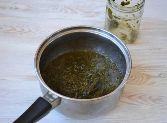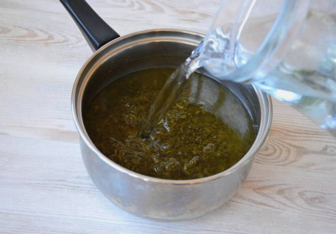 - Voeg daar een beetje water toe, dat eerder gekookt en afgekoeld was. Kook op laag vuur.