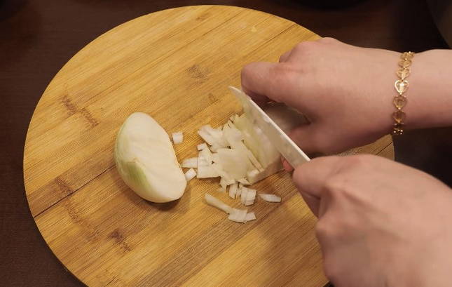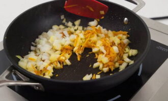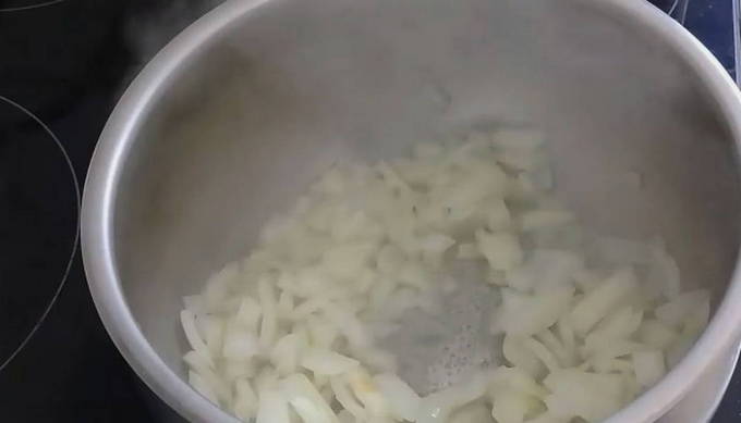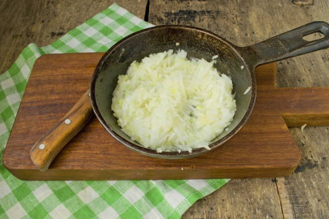 - We verwarmen een pan met dikke bodem met plantaardige olie en sturen gehakte uien een paar minuten door tot ze doorschijnend zijn.
