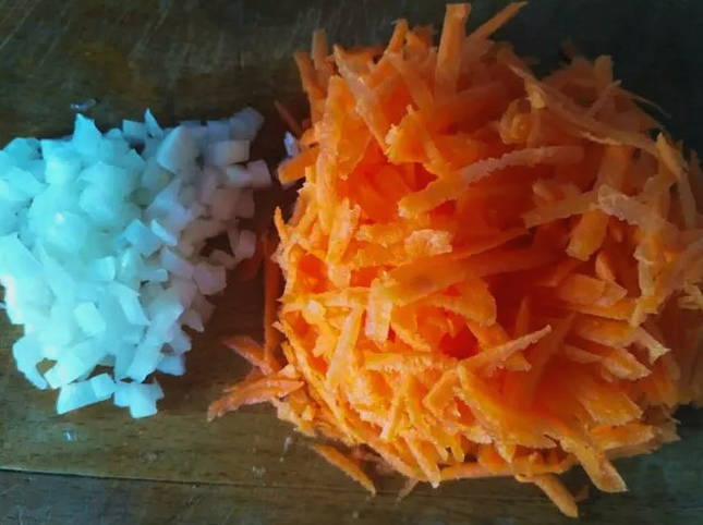 - Wrijf de geschilde wortelen op een middelgrote rasp en snijd de uien in kleine stukjes. Verhit een pan met dikke bodem samen met olijfolie, waarin we vervolgens de gesneden wortelen en uien op middelhoog vuur vijf minuten bakken tot ze zacht zijn.