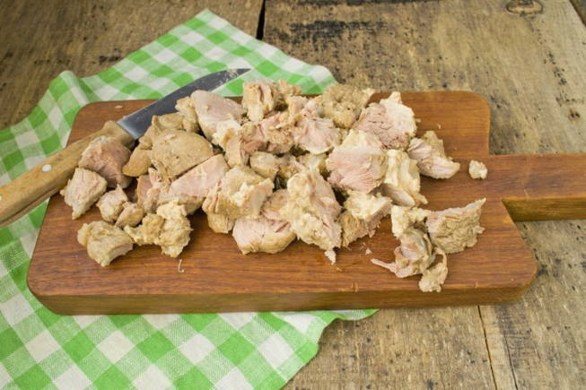 - We snijden het gekookte vlees willekeurig in vrij grote stukken en sturen het terug naar de bouillon. Meng de gehele inhoud lichtjes en kook tot het kookt.