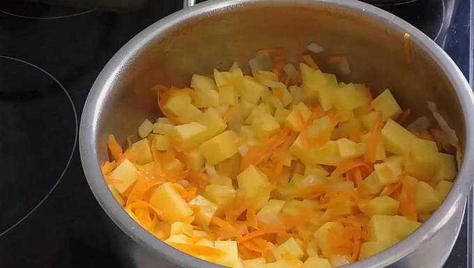 - Giet hier geraspte wortelen en bak op laag of middelhoog vuur tot de groenten zacht zijn. Voeg na 5 minuten de aardappelen toe en vul met een kleine hoeveelheid koud water. Roer het frituren en laat het tien minuten sudderen.