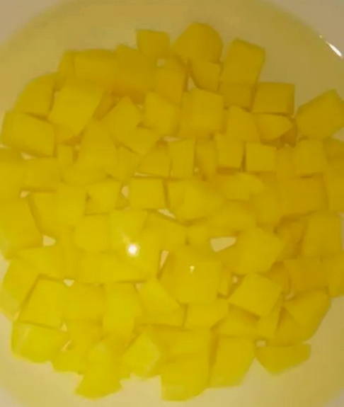 - Snijd de geschilde aardappelen in blokjes.