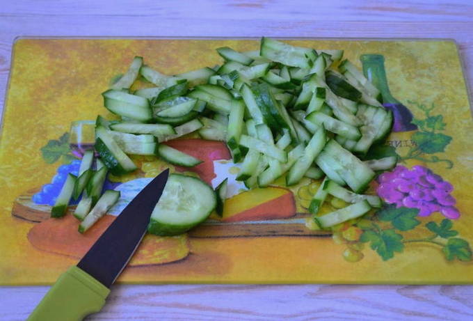 - Hetzelfde doen we met verse komkommer. Als de schil dun is, mag deze niet worden afgepeld.