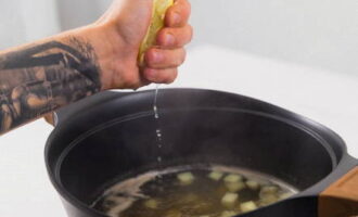 We controleren de gereedheid van de aardappelen en persen vervolgens het sap uit de ene helft van de citroen.