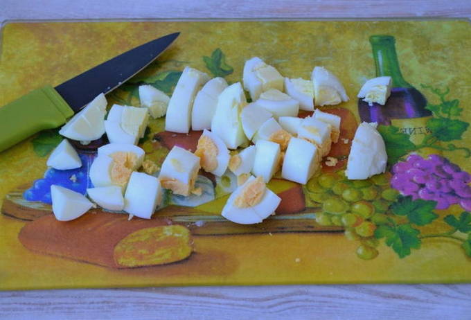 - Kook de eieren, laat ze afkoelen en hak ze willekeurig fijn en voeg ze toe aan de inhoud van de kookpan.