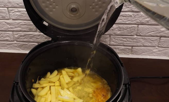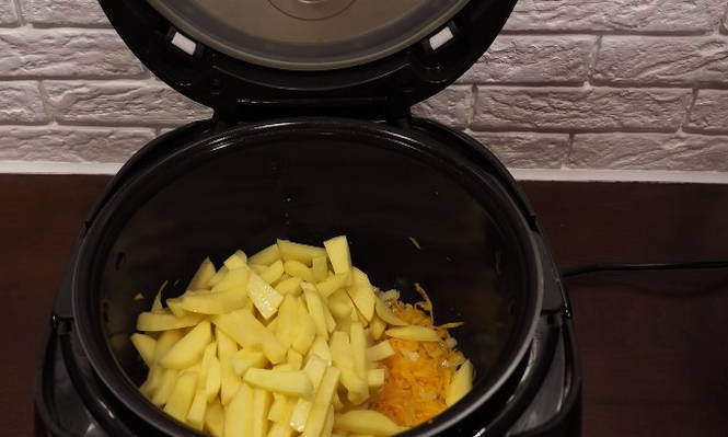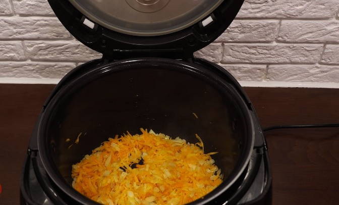 - Giet plantaardige olie in de multicooker-kom en stuur wortels met uien. We zetten de "frituur" -modus aan en bakken de groenten gedurende 5 minuten.