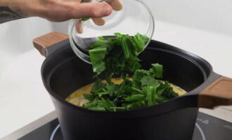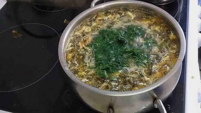 - Voeg na deze tijd het hoofdingrediënt - gehakte zuring toe aan de afgewerkte soep en laat het 5-10 minuten onder een gesloten deksel brouwen.