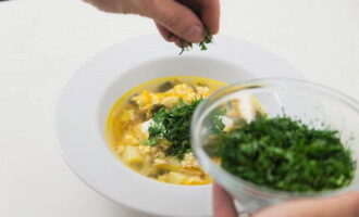 - Kook de soep nog 7-10 minuten en meng alle ingrediënten grondig. Voeg in hetzelfde stadium zout, gehakte greens toe. Schenk de soep in geportioneerde borden en serveer op tafel, breng op smaak met verse zure room.