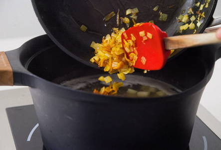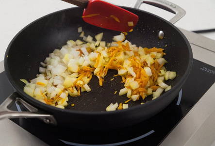 - Wrijf de geschilde wortelen op een middelgrote rasp en snijd de uien in kleine stukjes. Verhit een pan met dikke bodem samen met olijfolie, waarin we vervolgens de gesneden wortelen en uien op middelhoog vuur vijf minuten bakken tot ze zacht zijn.