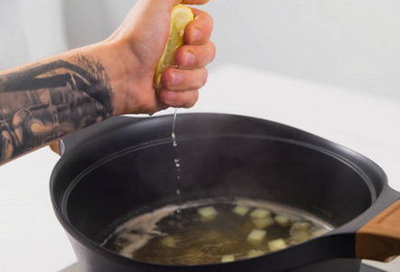 We controleren de gereedheid van de aardappelen en persen vervolgens het sap uit de ene helft van de citroen.