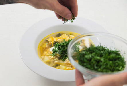 - We sturen de gehakte ingrediënten twee minuten aan de kook in de kokende soep. Voeg wat zout toe en zet het vuur uit.